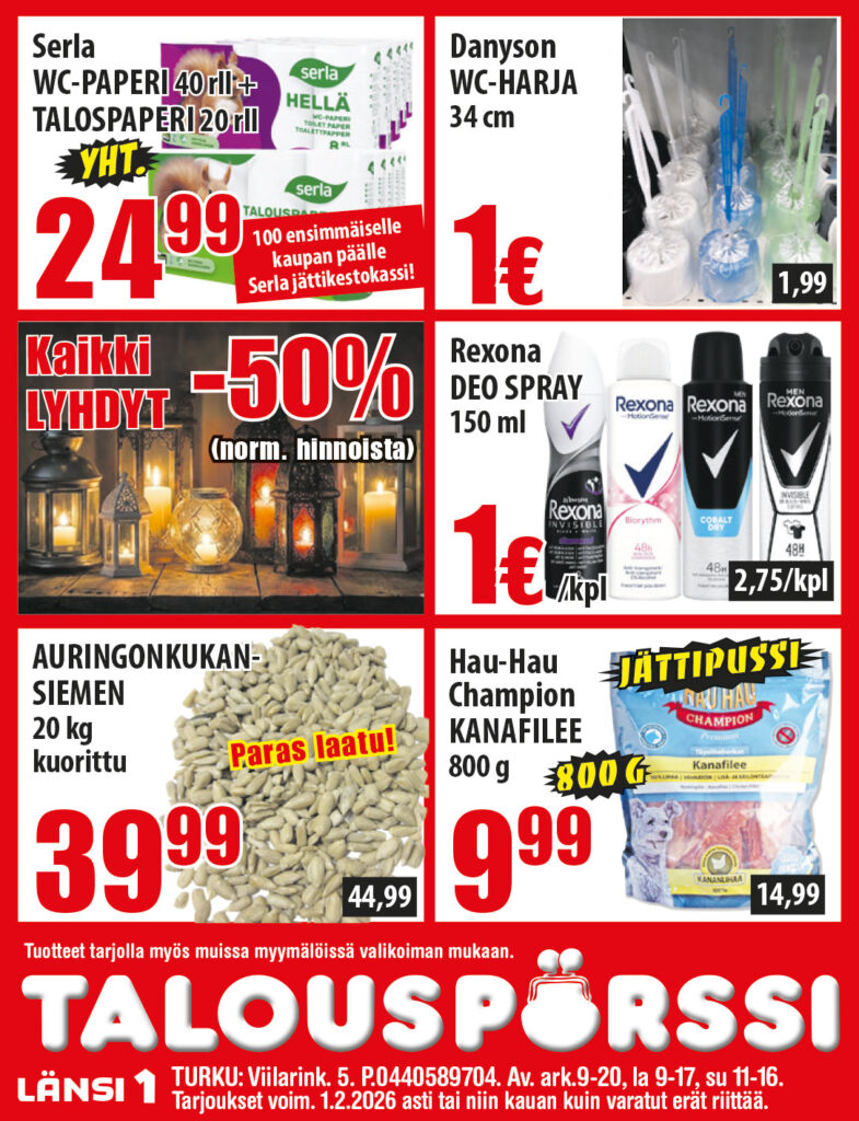 Talouspörssi on Turkulainen perheyritys joka on palvellut asiakkaitaan jo vuosia tarjoamalla viikkottain erittäin edullisia tarjouksia ja laadukkaita tuotteita helpottamaan arkea. Talouspörssistä löytyy laaja valikoima kaikkea kotona tarvittavaa kuten elintarvikkeita, lemmikkituotteita, taloustavaroita, työkaluja, tekstiilejä sekä paljon muuta.